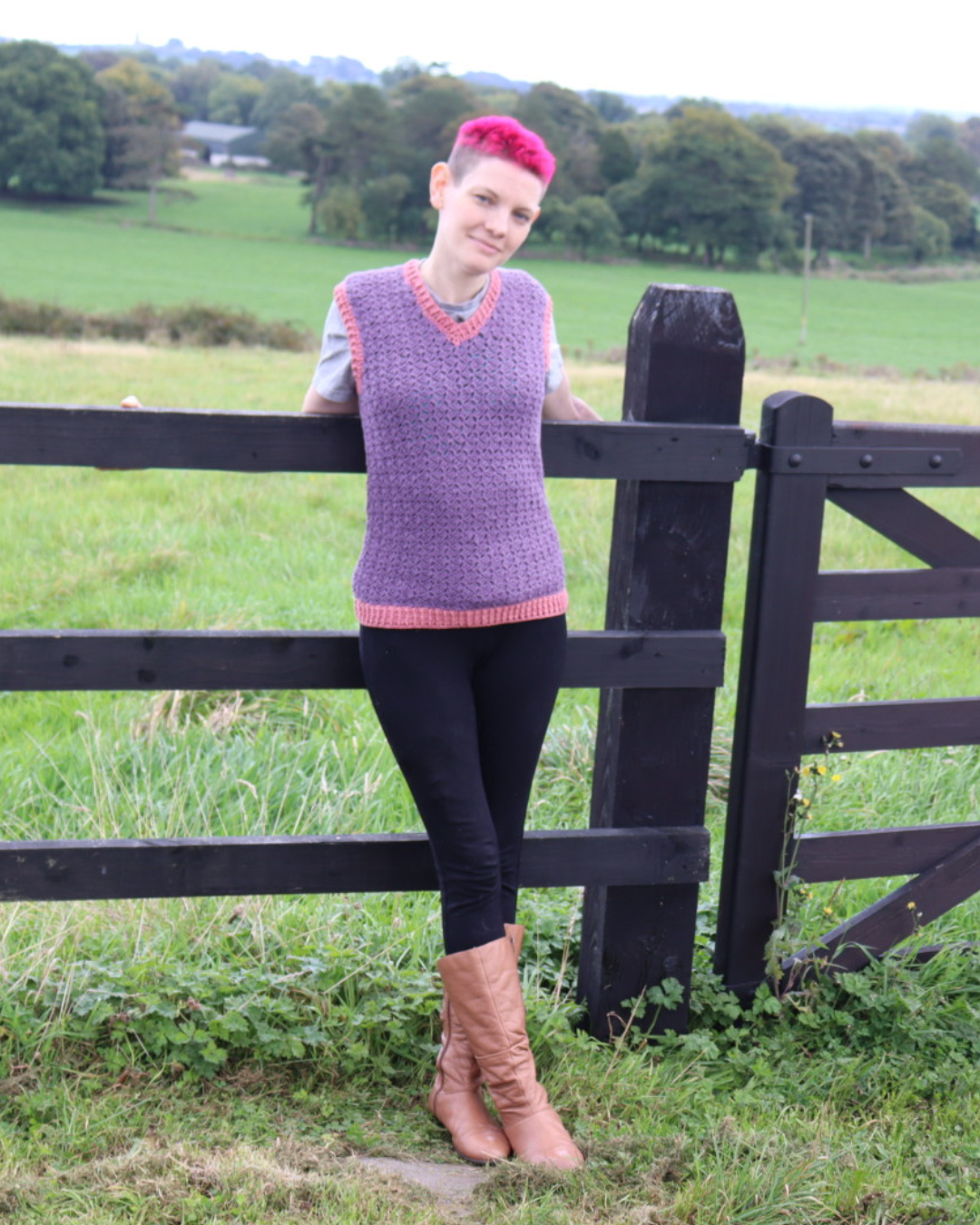 A gender neutral vest crochet pattern in a simple, fun stitch. The overall look is one of flattering horizontal lines, which seem to ripple as the garment moves, reminiscent of a calm sea under a gentle breeze. It is a versatile vest, suitable for dressing up as formal workwear or teaming with jeans for a casual look.