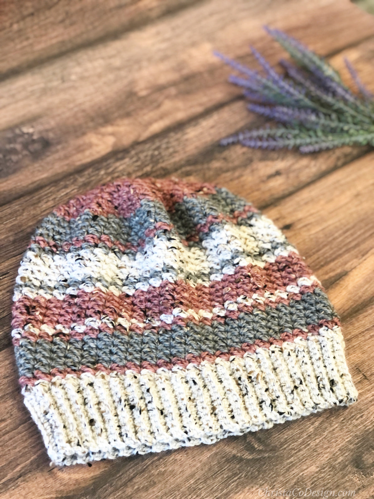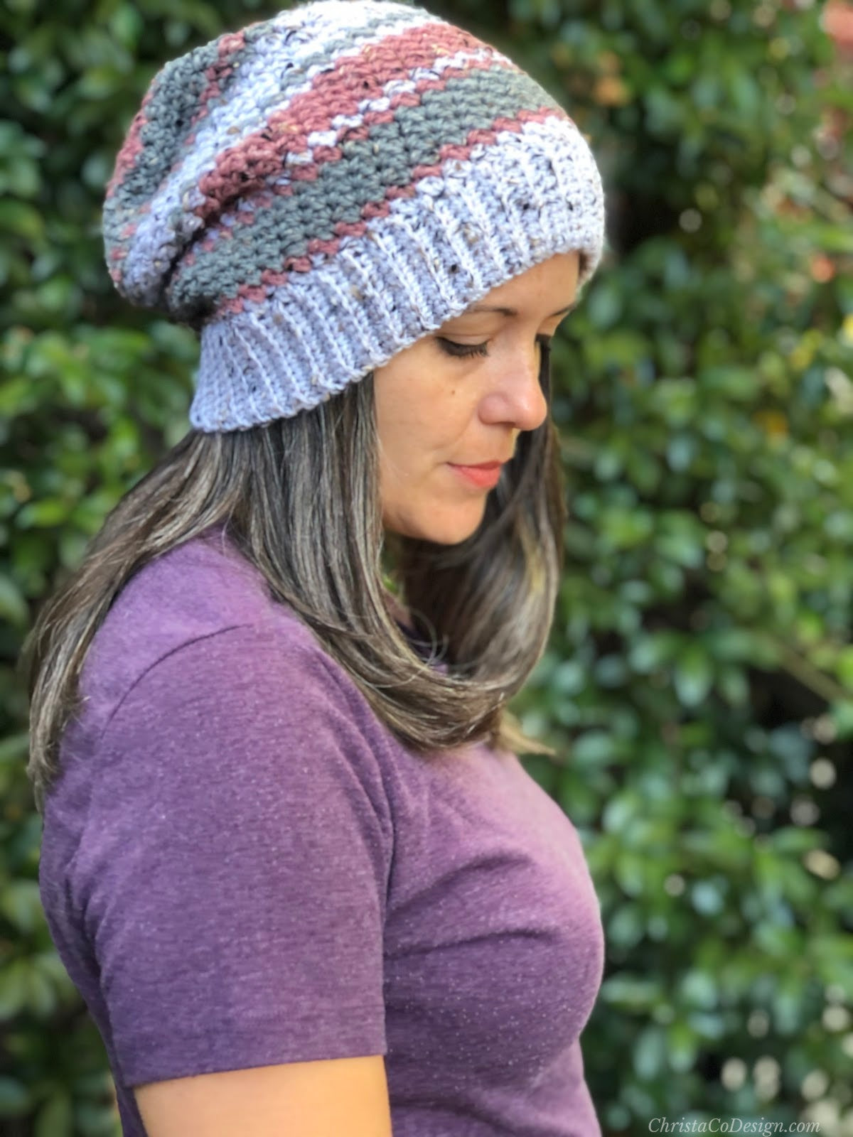 This striped slouchy hat fits like a dream. The lightweight DK yarn provides warmth while the slouch adds style. Choose contrasting colors to create drama in your own striped slouchy hat. The written pattern includes instructions for adjustments. Plus there are tutorials linked for all stitches, and a full video tutorial as well.