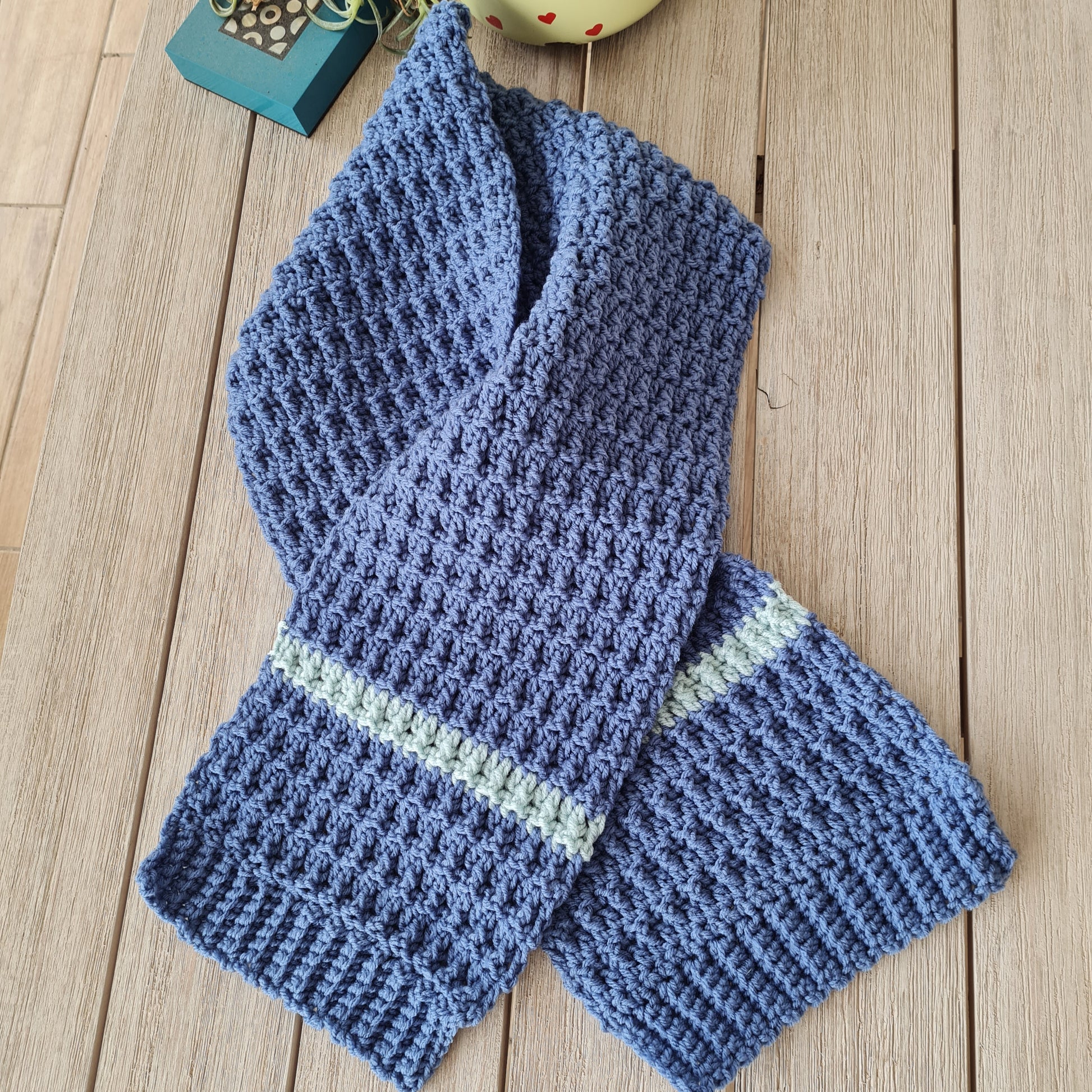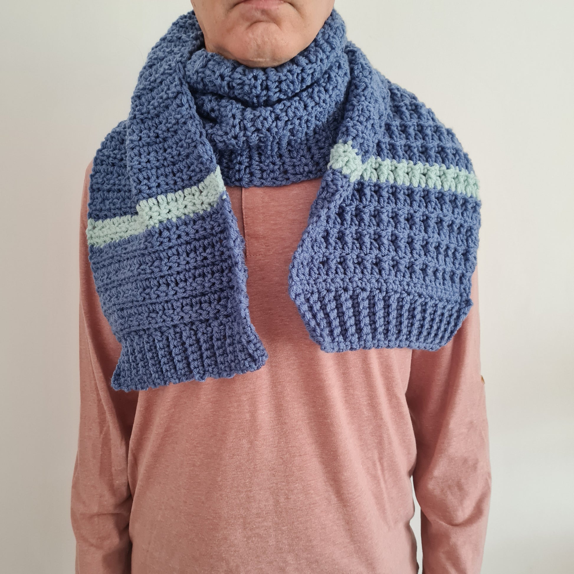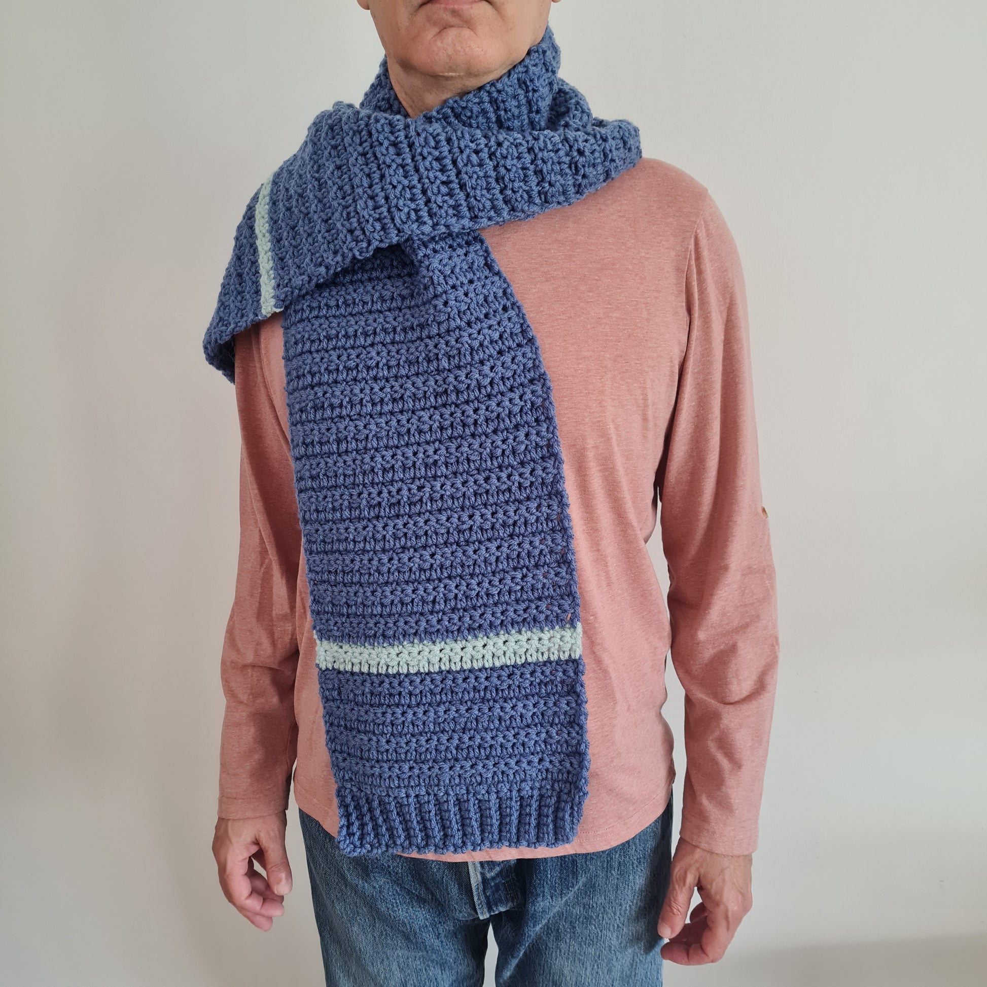 Super Cozy scarf pattern for men or woman. Made in one piece with two ribbings.