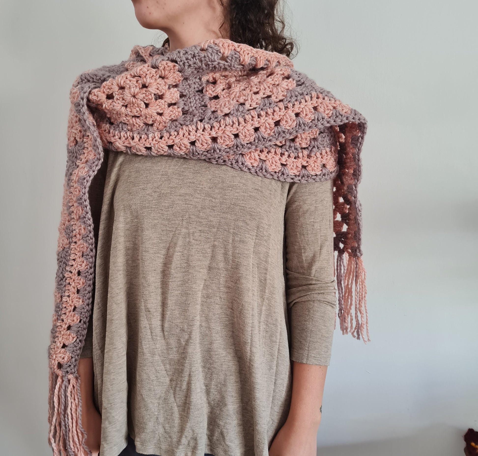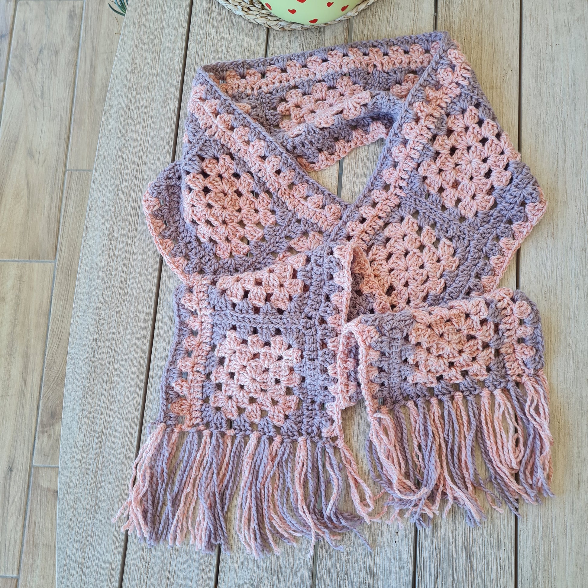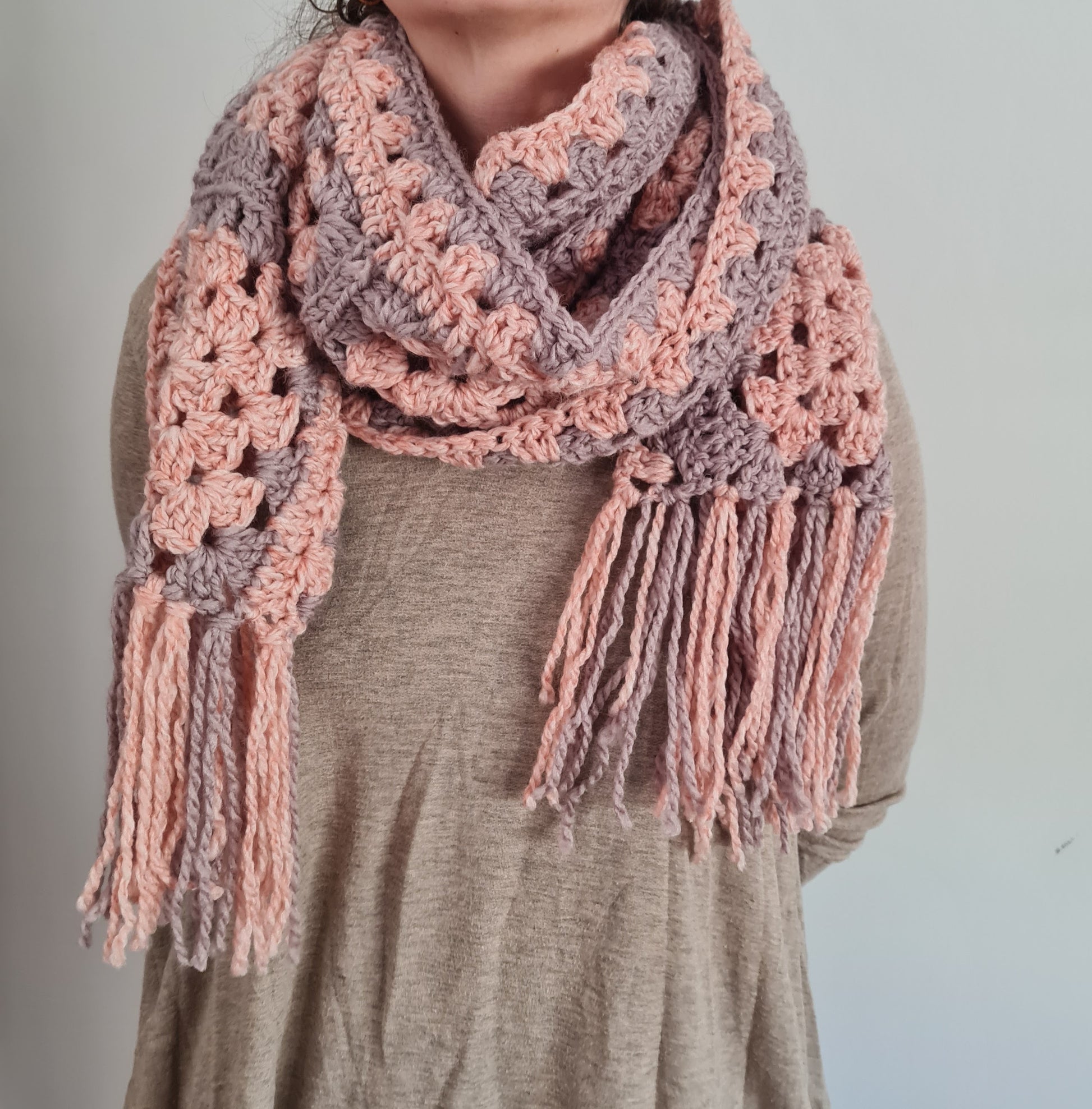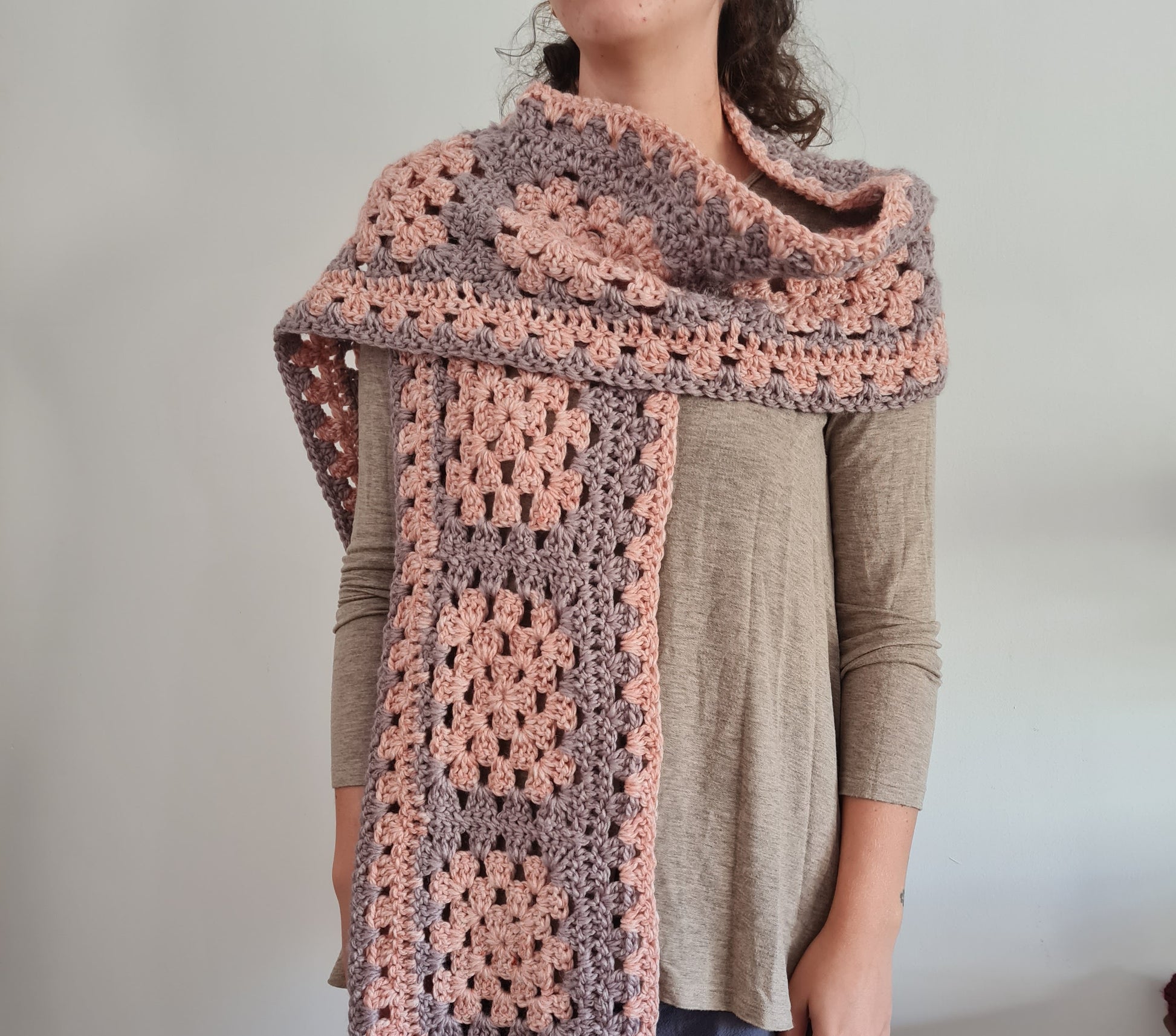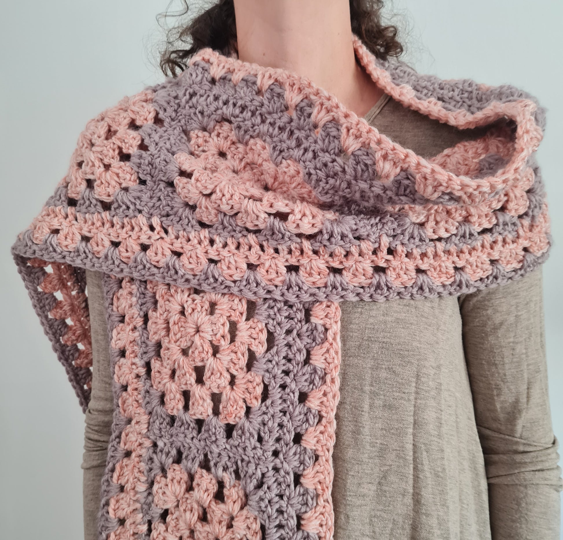 Super cozy and fun Granny Squares Scarf Pattern using a soft blended yarn in two colors.