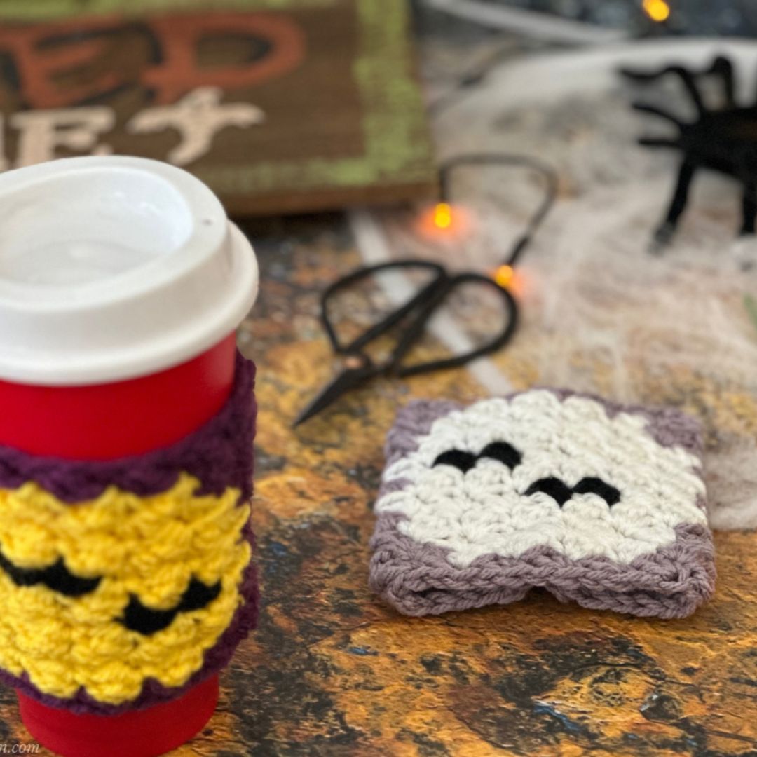 Create a Halloween themed cup cozy with this free crochet pattern. The full moon and flying bats are easy to make with color changes.