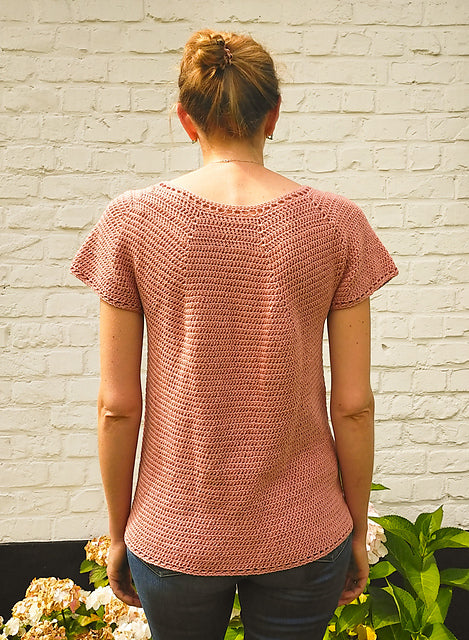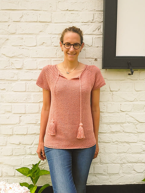 The Julia summer top crochet pattern is a feminine and playful crochet top pattern. Simple eyelets add a lace detail to the sleeves, bottom and neckline. Wear it with a pair of shorts for a cute everyday casual summer outfit. Or add a jeans and open cardigan on chiller days. Made out of LionBrand Coboo, a dreamy cotton bamboo blend, it’s a delight against your skin with great drape. Thanks to the top-down in the round construction you’ll be able to try your top on as you go and won’t have to spend any time sewing.