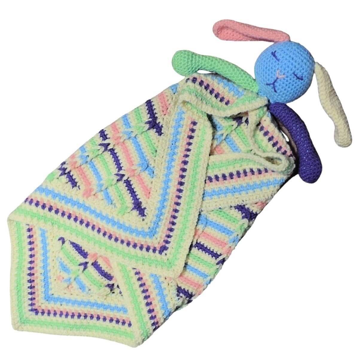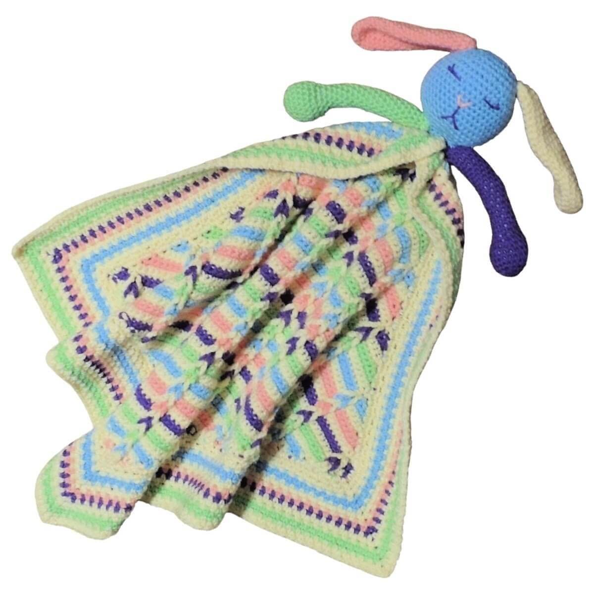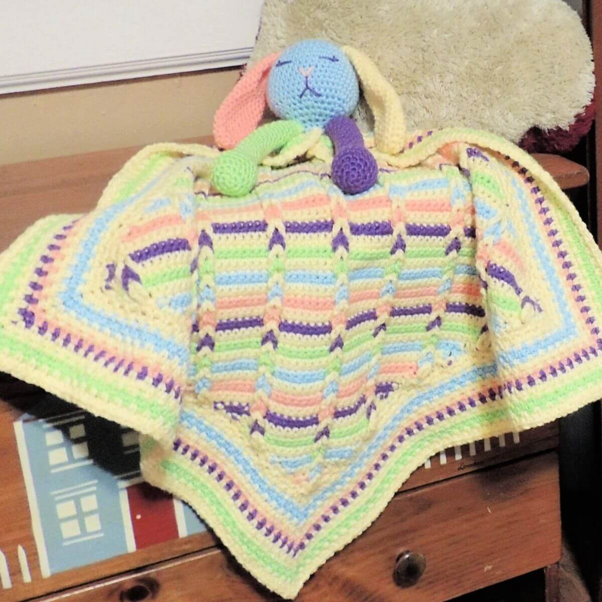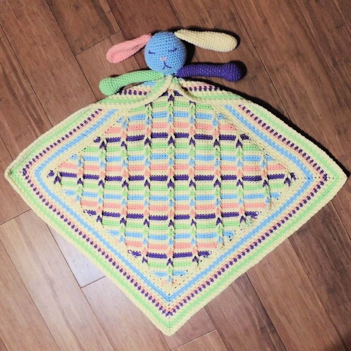 Leo the Lovey is my way to honor one of my favorite childhood books: Leo the Lop. This lop will bring love to any child! I wanted to make a corner lovey, and decided to go with a bunny. As I was making the ears, I thought of Leo the Lop and just knew I had to make the bunny lop-eared and name it Leo the Lovey. The blanket features a center of reversible Jacob's Ladder stitch, with a border of linen stitch.