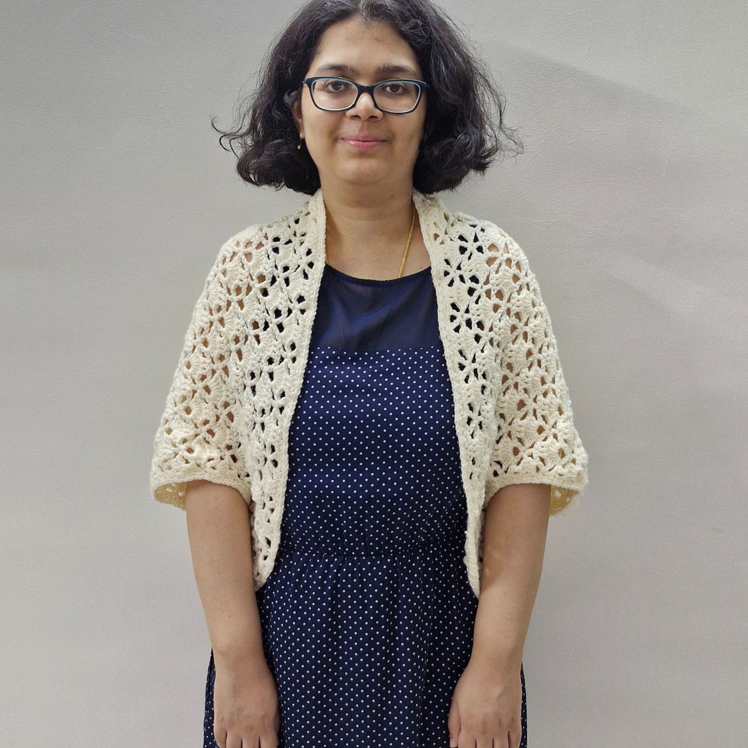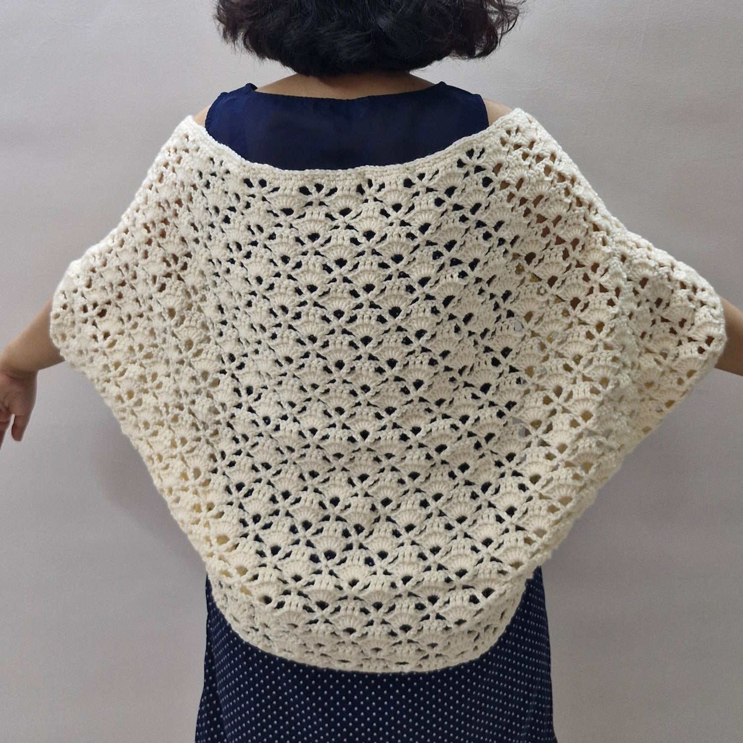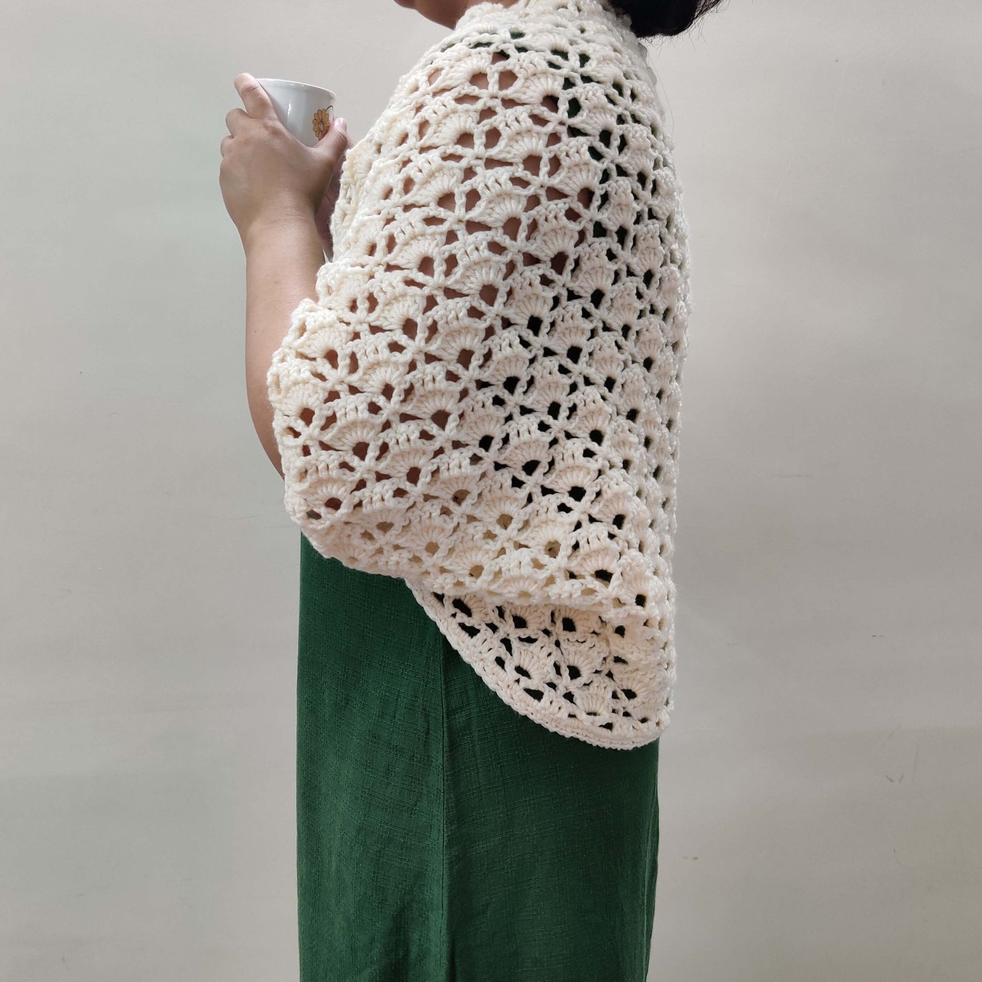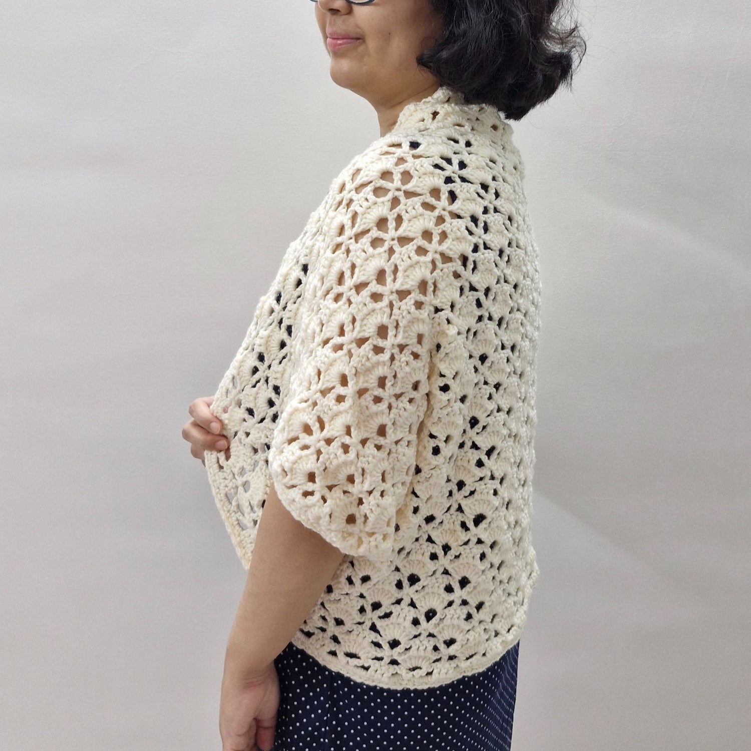 Featuring a lovely combination of V-stitches and shell patterns, the design is light, lacy, and beginner-friendly. Best of all, it's made from a single rectangle—no shaping needed! Just a bit of simple seaming to form the armholes, and you’ve got yourself a stylish cropped cardigan that’s as effortless to make as it is to wear.