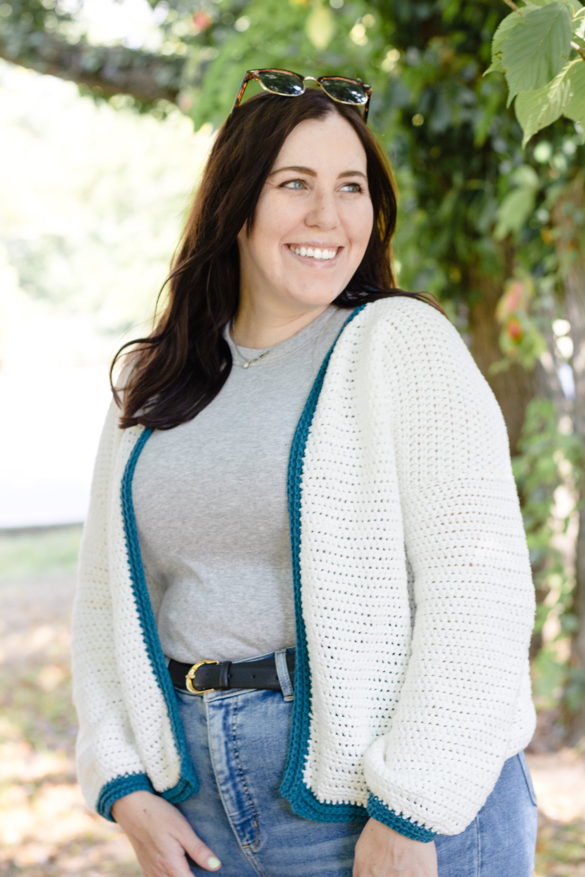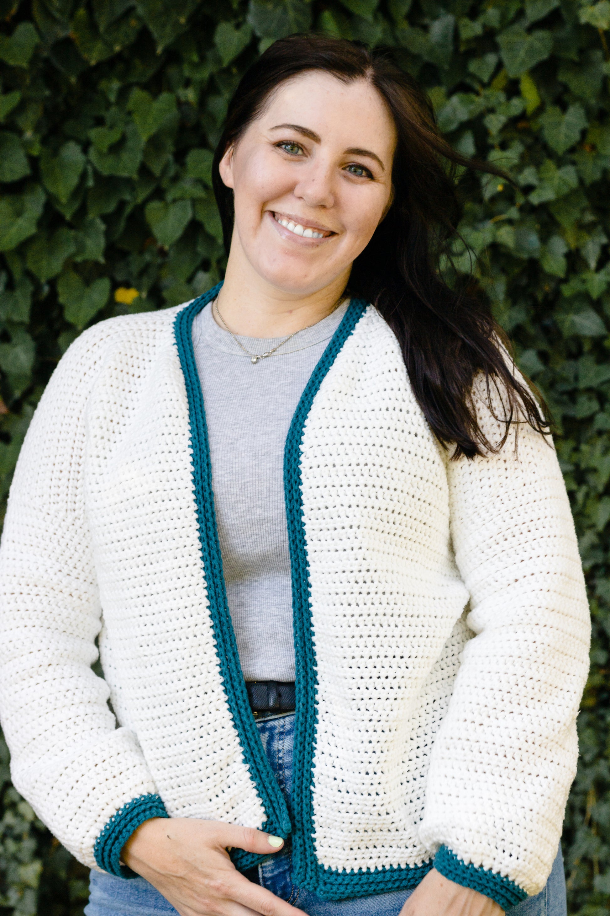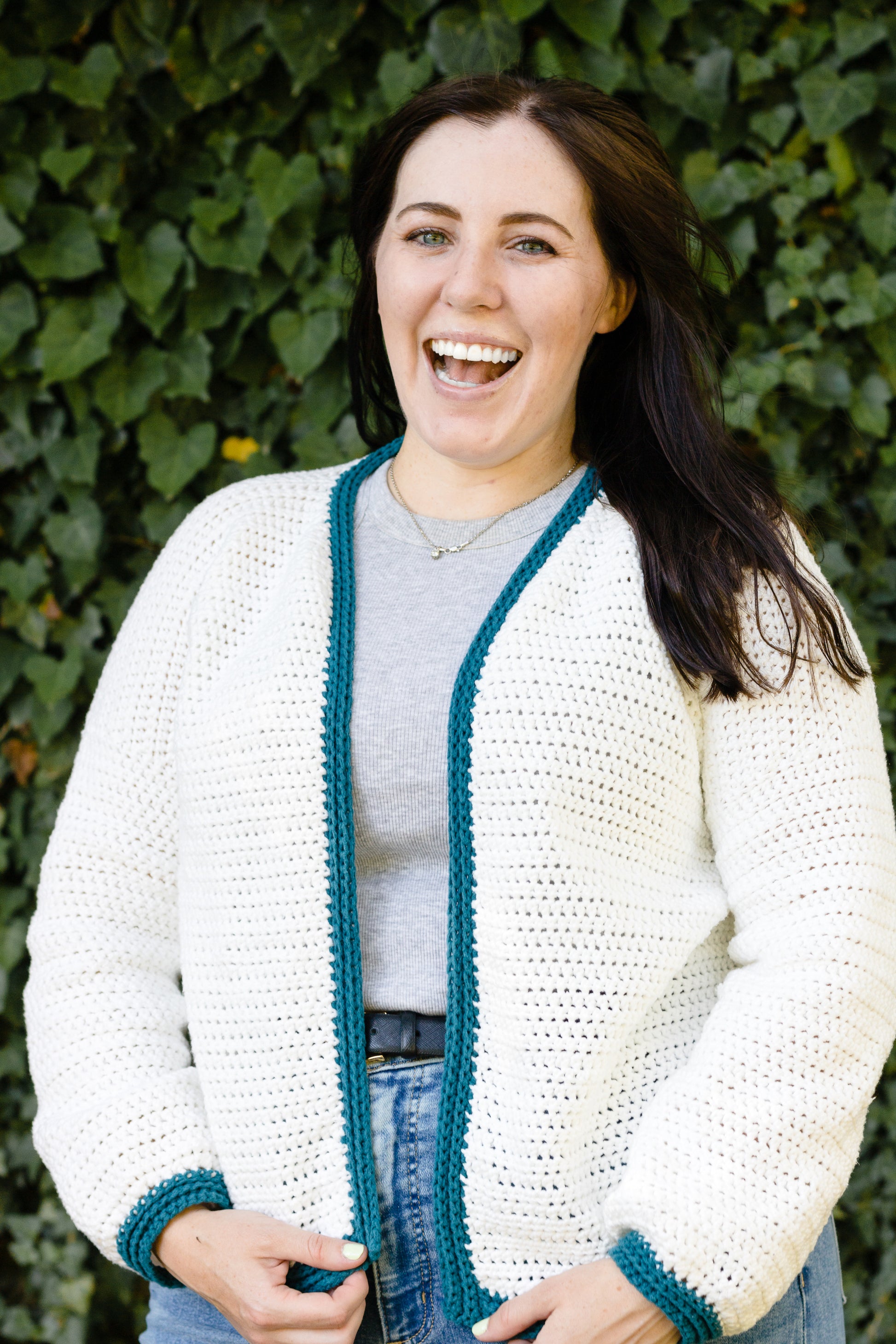 Say hello to the Mysa Cardigan! Mysa is the Swedish word for cozy with a focus on being relaxed & taking time out from stress for spending time with friends & being in the moment. With that in mind, my goal was to make a cardigan that’s simple and easy to make so you can be totally relaxed as you crochet! Yardage Color A: 5 (6, 6, 7, 8) (9, 9, 10, 11) balls of Lion Brand Feels Like Butta in Optic White (Color A) or 1010 (1150, 1290, 1410, 1585) (1775, 1930, 2135, 2210) yards of similar yarn that matches gauge. Yardage Color B: 1 (1, 1, 1, 1) (2, 2, 2, 2) balls of Lion Brand Feels Like Butta in Teal (Color B) or 180 (190, 200, 205, 215) (225, 235, 245, 255) yards of similar yarn that matches gauge