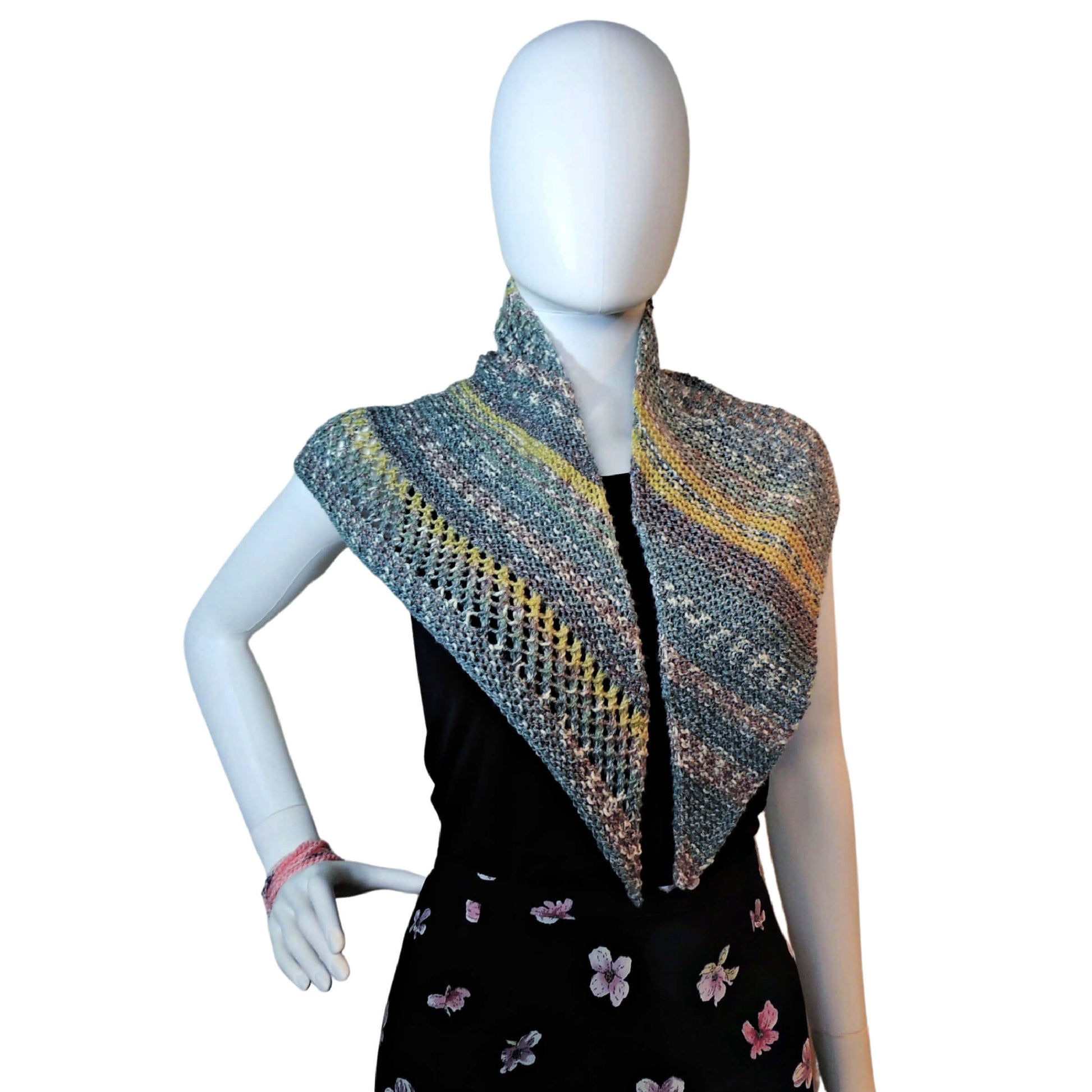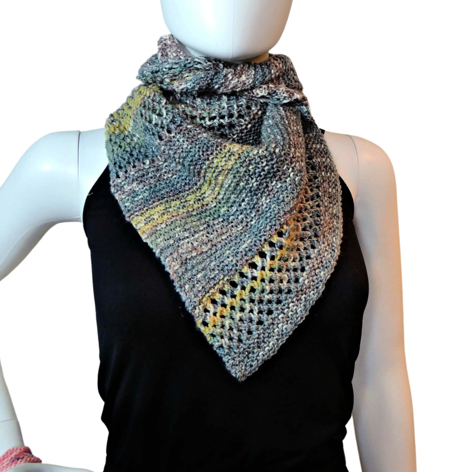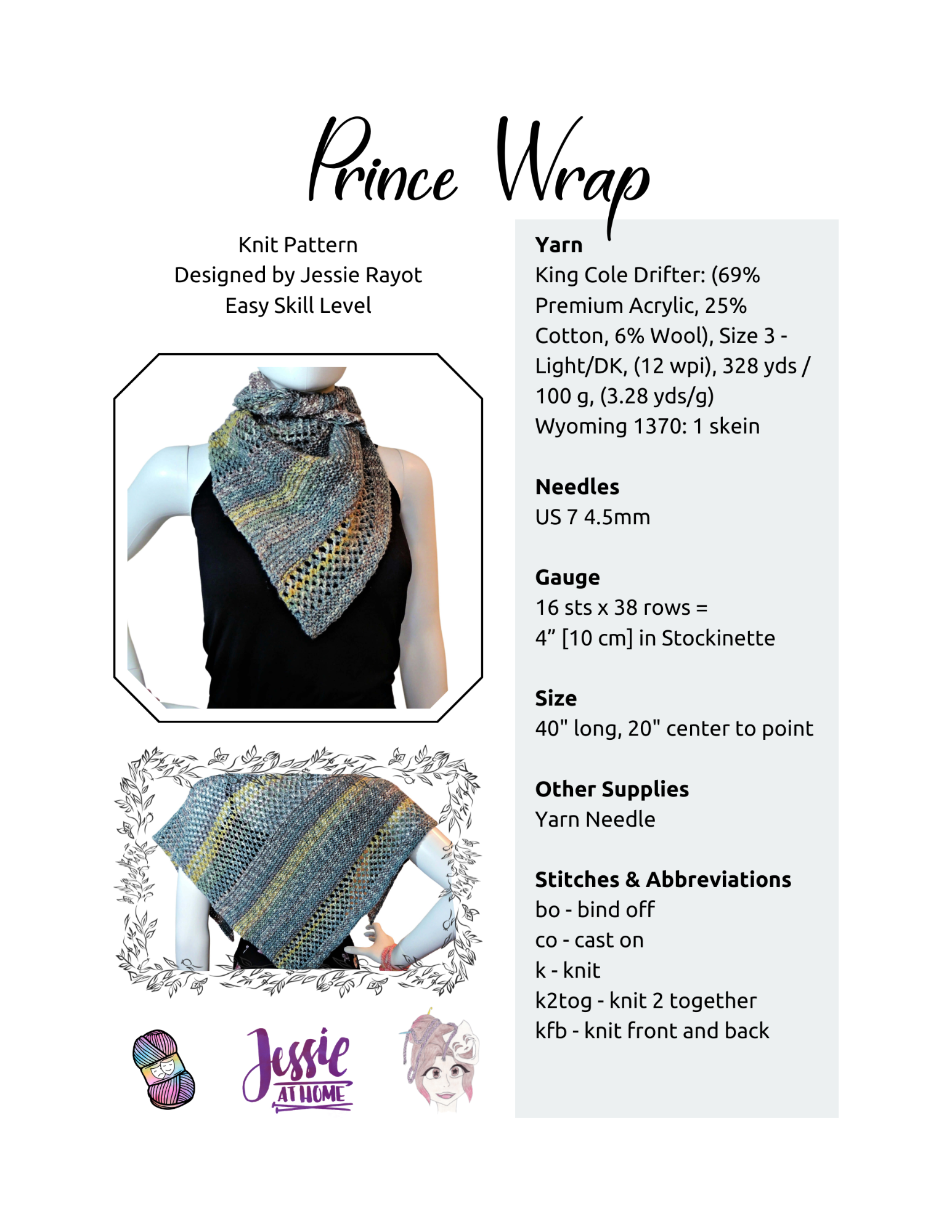 The Prince Wrap is a small, unisex, triangular wrap made of garter stitch and eyelets. It's quick and easy, yet lovely to look at. The eyelet mesh sections bring interest into the wrap, while still keeping its unisex appeal. Made with one skein of King Cole Drifter, it’s a smallish neckerchief, however, if you want to make it larger, just check out the Getting Started section.