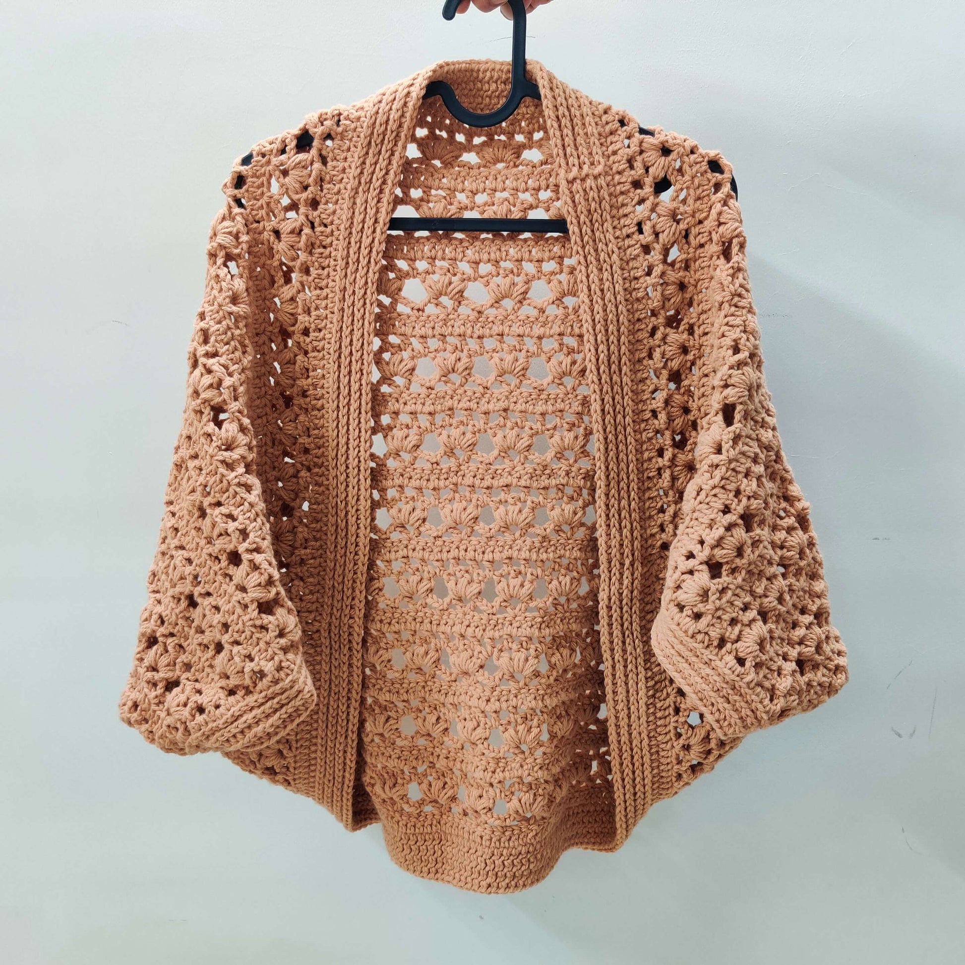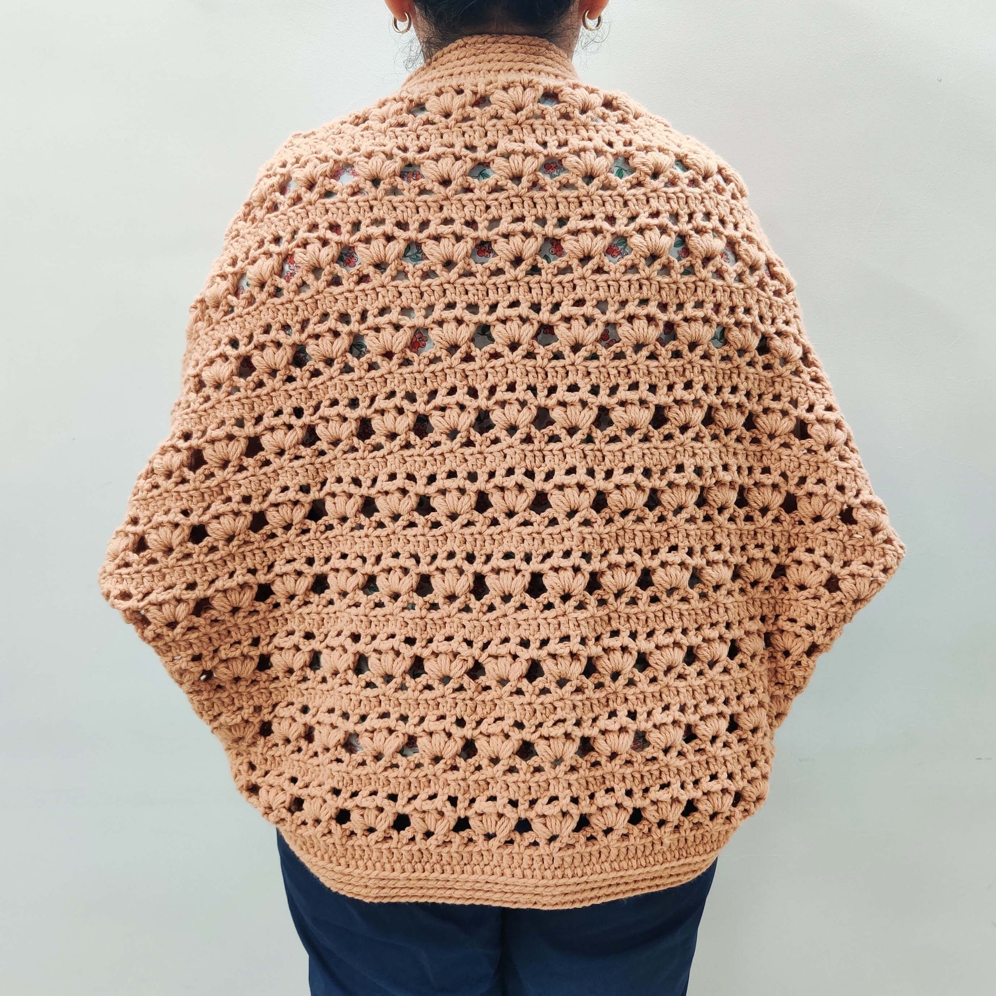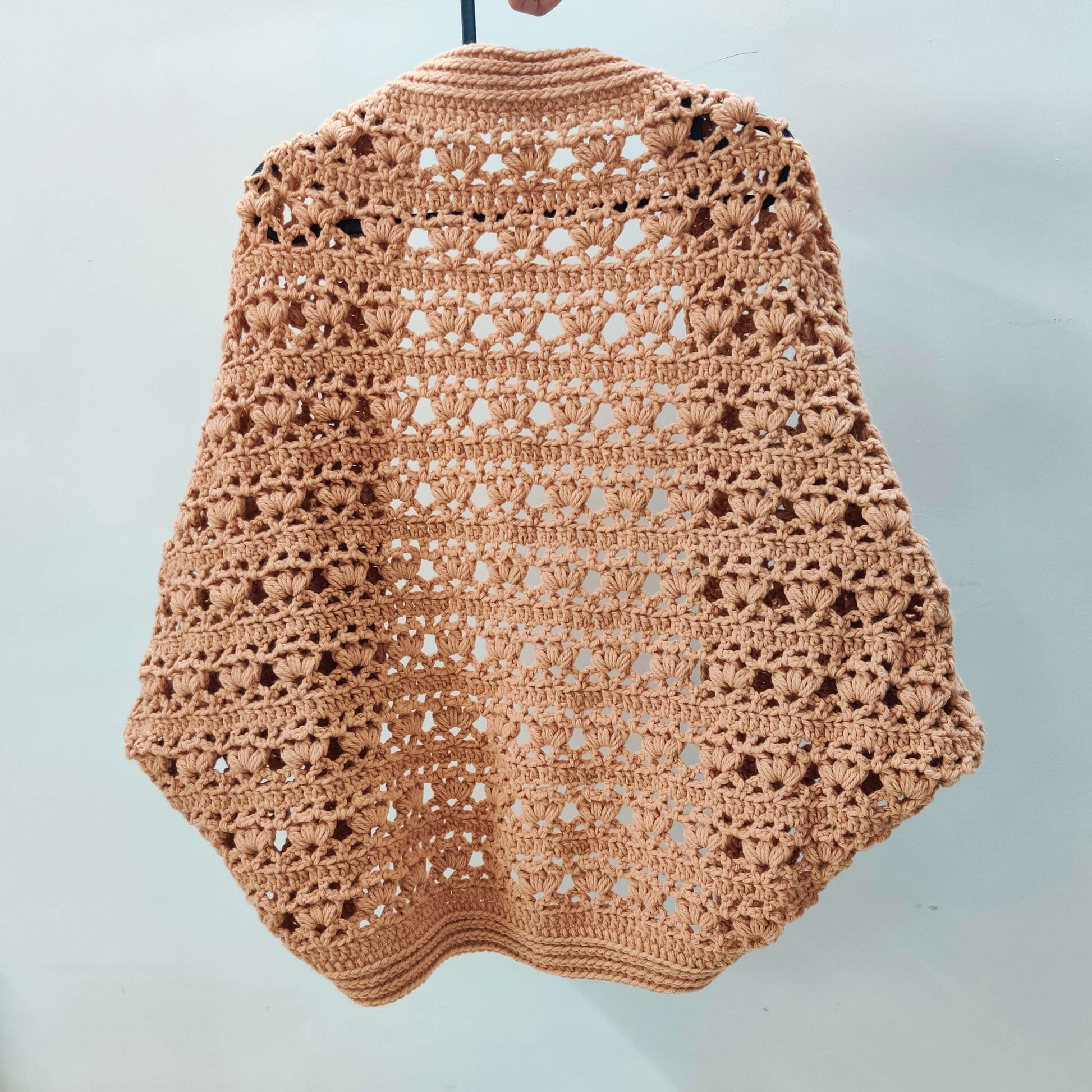 Featuring an easy, puff and lacy stitch repeat, this cocoon-style cardigan is ideal for layering over your favorite tops and dresses. The openwork design adds a touch of elegance, while the shape give it that comfy, hug-like feel. Whether you’re lounging at home or heading out for coffee, this shrug is your go-to layer for fall and beyond.