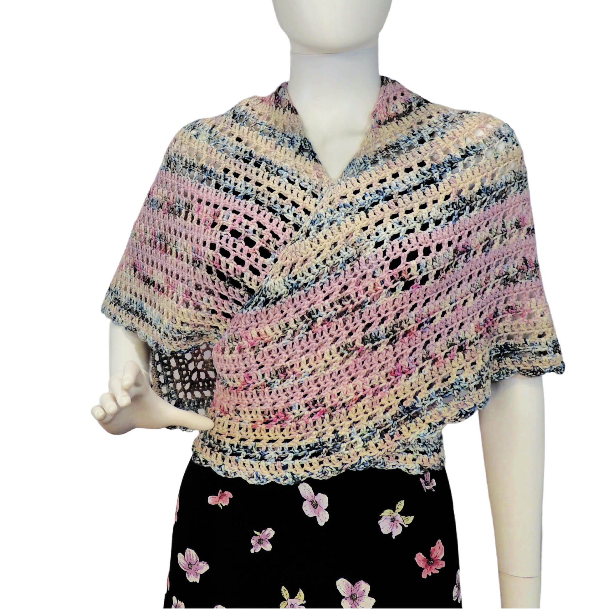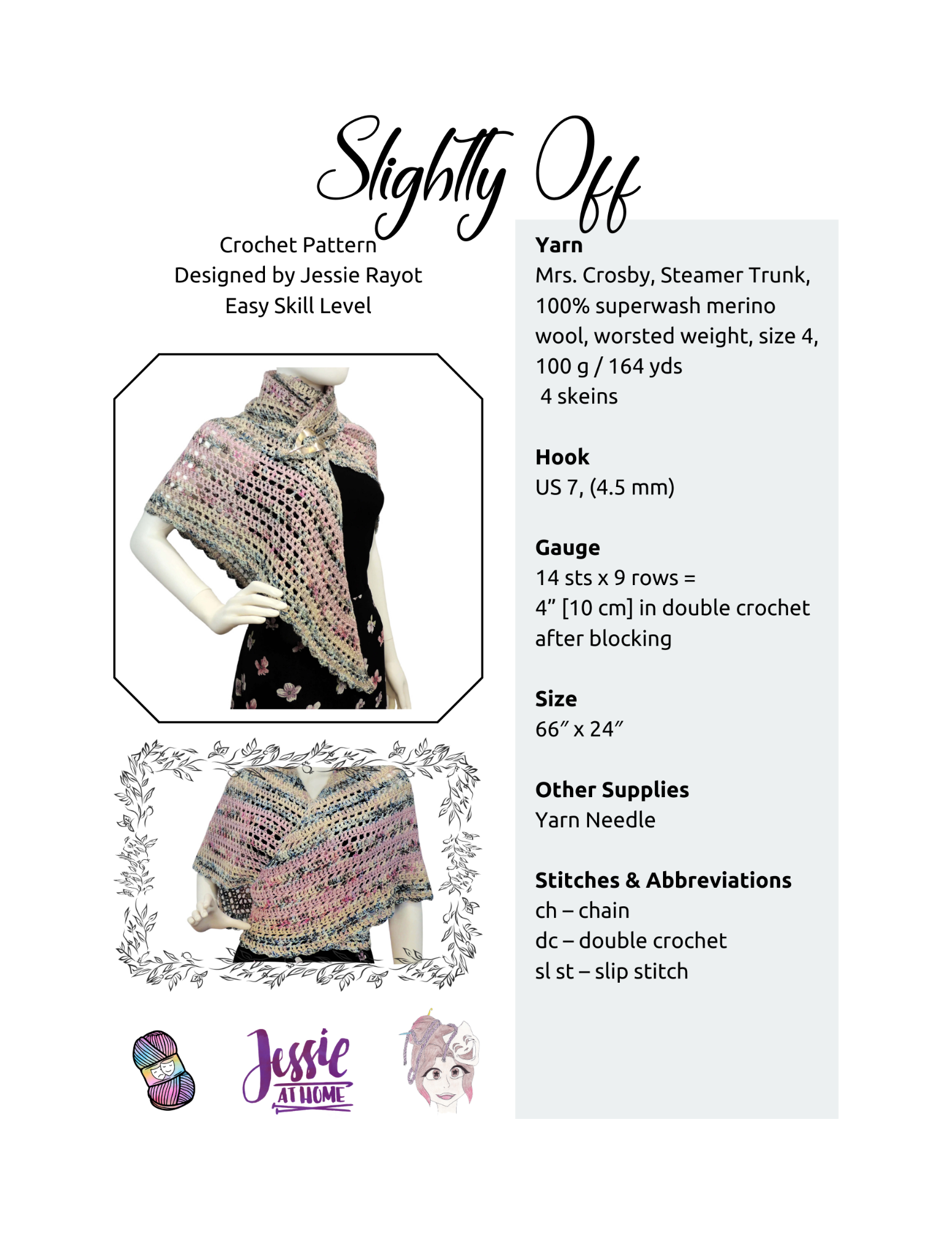 I had this kooky idea for another asymmetrical pattern and so I gave it a go. It didn't turn out quite the way I thought it was going to, but I really like it. Due to the increases being different on each side, the center line is "Slightly Off" - just like me! :) I hope you enjoy this shawl. It was fun to make and is fun to wear. I like centering the center line down my back, draping the shorter side over my shoulder, and then wrapping the longer side around my neck and securing with a shawl pin.