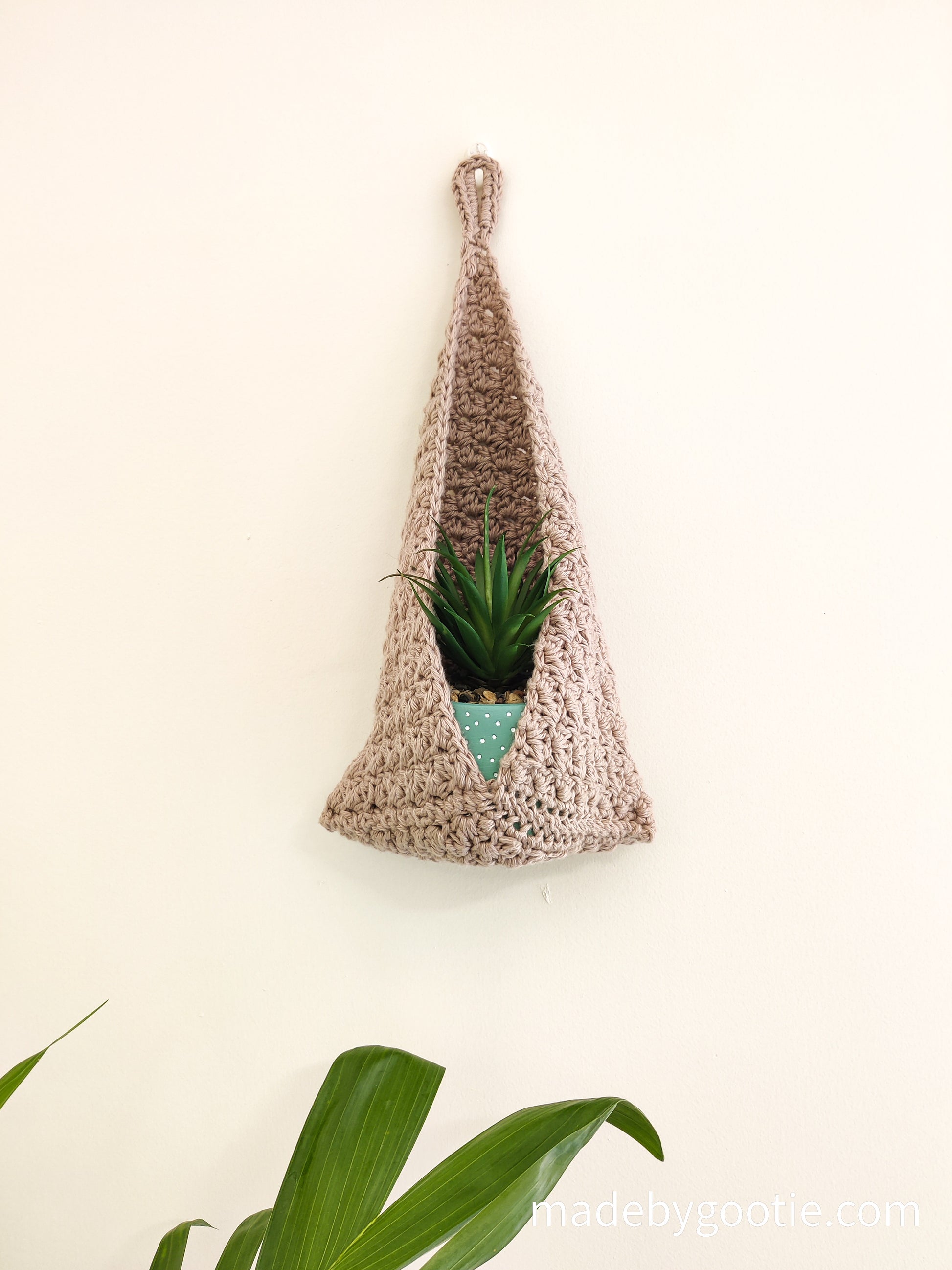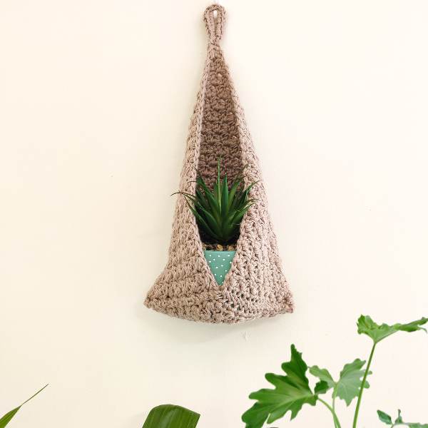 The basket is made out of a square where 3 of its corners are folded towards the middle and then sewn along the sides. The square is made using the Suzette Stitch to obtain a nice textured fabric. The Suzette crochet stitch is made by using only single crochet and double crochet stitches. This crochet hanging basket pattern is a beginner friendly pattern, it is also a great crochet project if you want to learn how to crochet the Suzette stitch and end up with a super practical item. Stitches used in this pattern: single crochet, double crochet. The pattern is written using English (U.S) terminology. The pattern is worked with 2 strands held together.