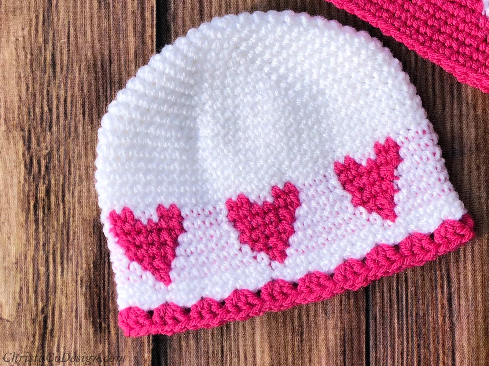 The Sweetheart Hat is a sweet gift to crochet for your loved ones for Valentine’s Day. This simple single crochet hat features color work hearts along the sides. Customize your hearts and hat to your liking. The written pattern includes pictures and video tutorial links. This crochet pattern is written for one stitch count and adjusting hook size to achieve size.