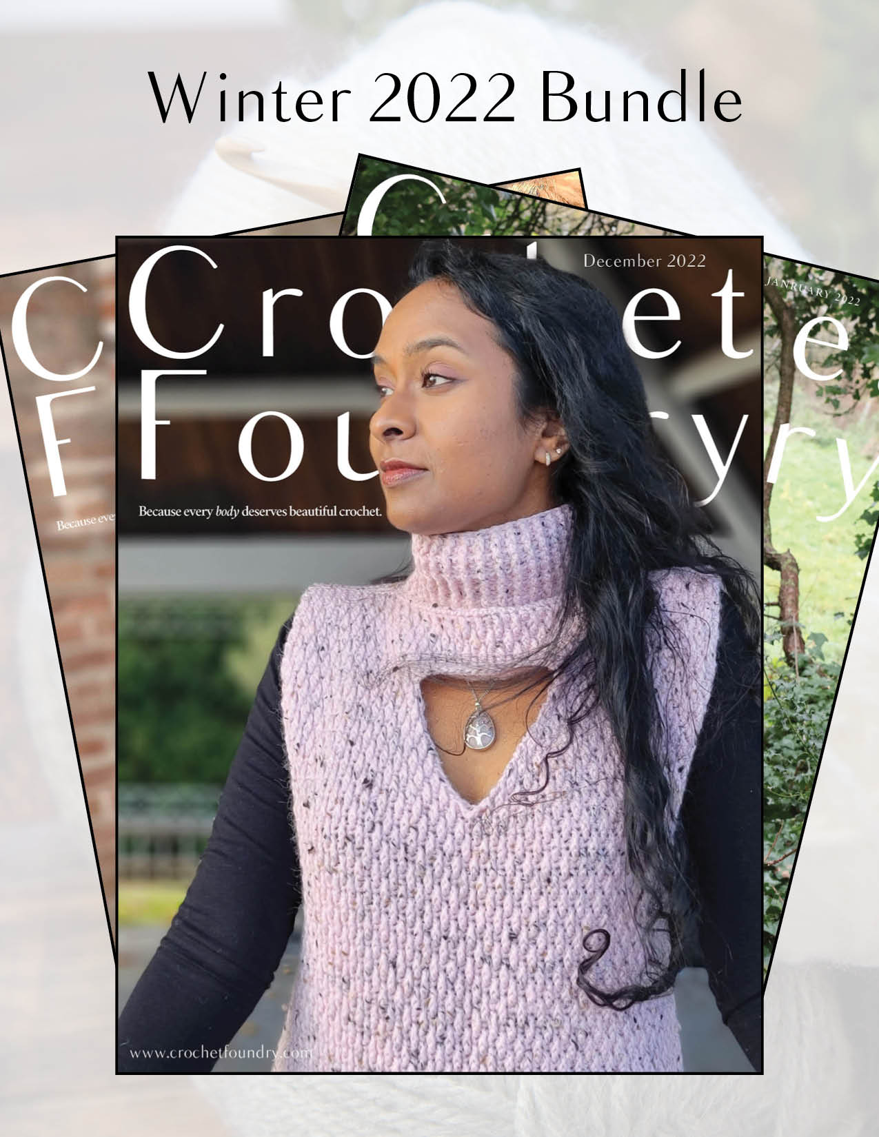 The Winter 2022/23 Digital Bundle includes 3 winter issues of Crochet Foundry Magazine. Each issue will contain five or more winter projects ranging from garments, to accessories, to home decor! This bundle is 20% off the retail price.