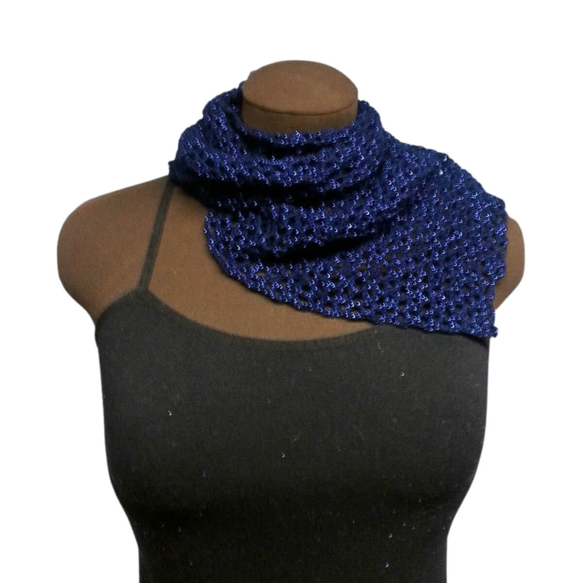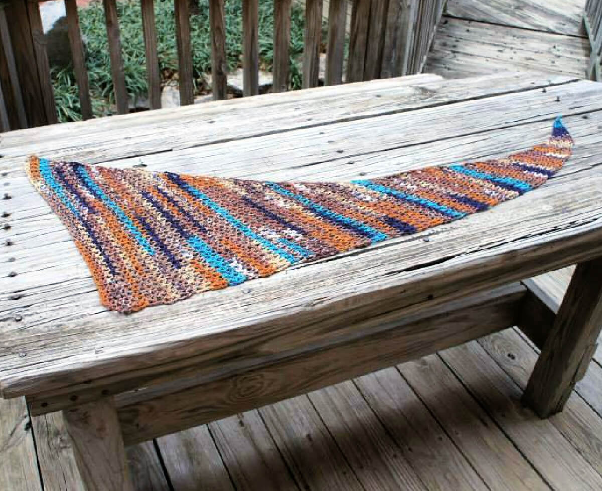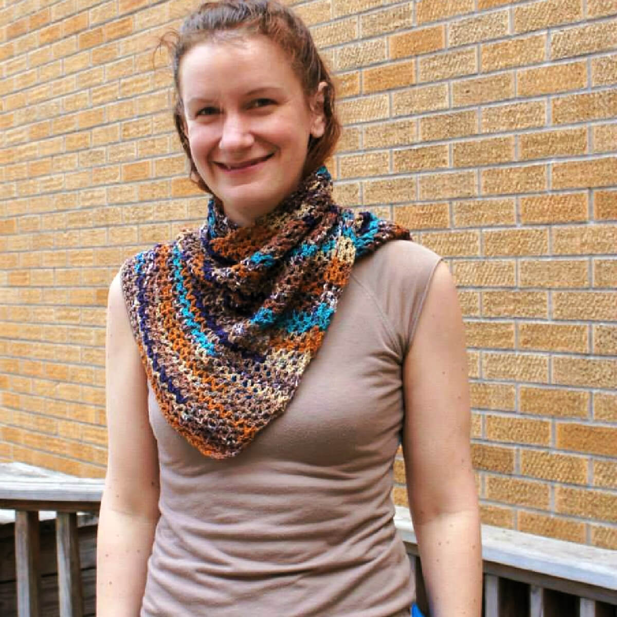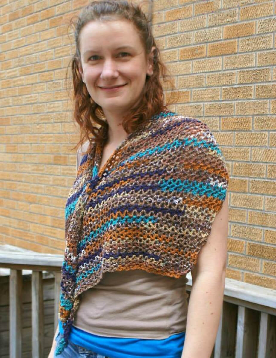 This off kilter wrap is simple to make and uses just one skein of yarn! You can make it larger by using more yarn, but it is a great size for a spring mini wrap/scarf with just one skein of Lion Brand Vanna's Glamour yarn.